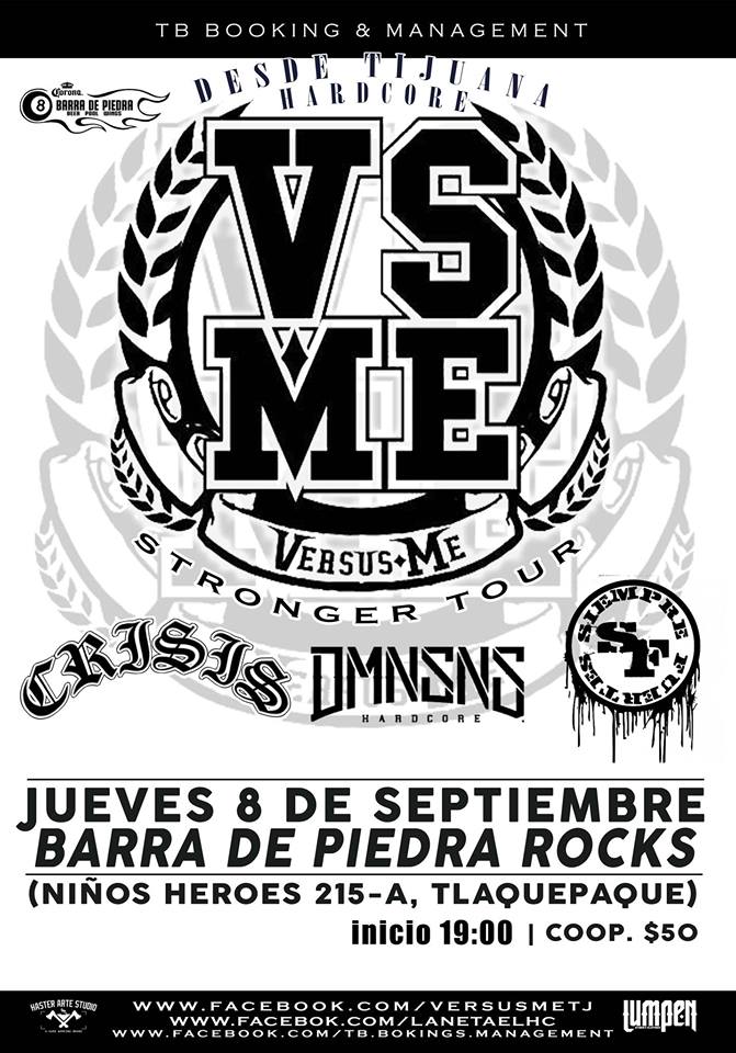 Fecha08 / 09 / 2016Hora19:00DirecciónNiños Héroes 215, TlaquepaqueCuánto50 pesosCongalBarra de Piedra RocksSoporteCrisisDMNSNSSiempre Fuertes